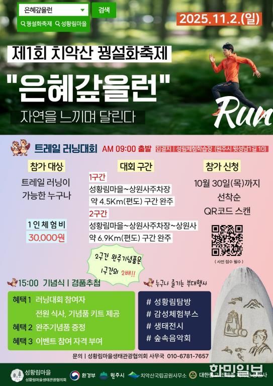 또한 은혜 갚은 꿩 설화 퍼포먼스, 성황림 숲 탐방, 생태 전시·체험, 숲속 음악회, 완주 인증자 경품 추첨 등 다채로운 부대행사도 준비돼 있다.