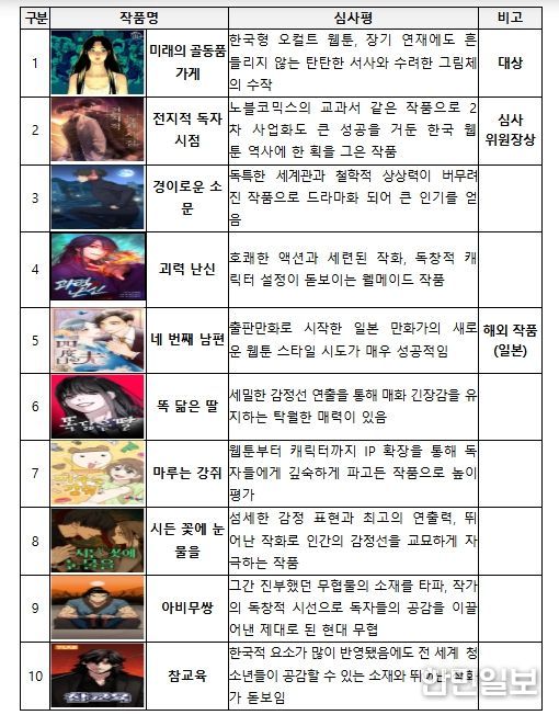 본상 10개 작품 중 대상 '미래의 골동품 가게', 심사위원장상 '전지적 독자 시점' 수상