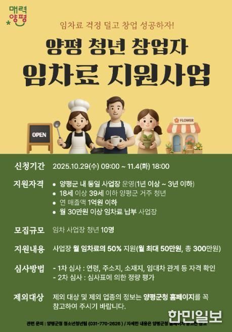 한민일보 서울포커스 차재만 기자 | 양평군은 지속되는 경기 침체와 고물가 등 어려운 창업 환경 속에서 청년 창업자의 임차료 부담을 완화하기 위해 ‘2025년 양평 청년 창업자 임차료 지원 사업’을 올해 처음으로 시행한다고 밝혔다.