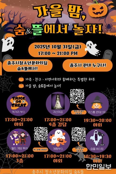 한민일보 서울포커스 김다남 기자 | 충주시청소년문화의집 숨·뜰에서는 10월 31일 오후 5시부터 9시까지 ‘가을밤, 숨뜰에서 놀자!’ 행사를 진행한다고 밝혔다.