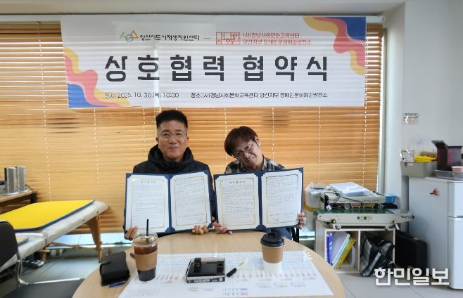 한민일보 서울포커스 김은금 기자 | 양산시 도시재생지원센터는 지난 30일 오전 (사)경남사회문화교육센터 양산지부 장애인문화예술발전소(지부장 나승기)와 장애인 문화예술 활성화 및 도시재생 기반 지역상생 협력을 위한 업무협약을 체결했다.