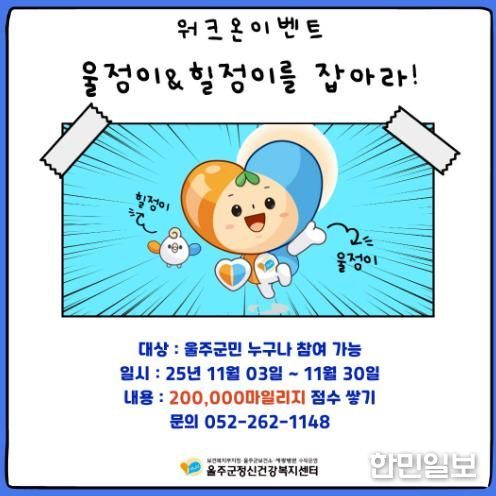 한민일보 서울포커스 기자 | 울주군정신건강복지센터가 3일부터 오는 30일까지 ‘마음건강 워크온 챌린지’를 운영한다고 밝혔다.