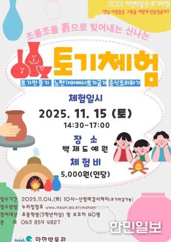 한민일보 서울포커스 김용택 기자 | 익산시 마한박물관이 초등학교 3학년 이상 학생과 그 가족을 대상으로 하는 오감 체험행사 '토기체험' 참가자를 오는 4일 오전 10시부터 선착순 모집한다.