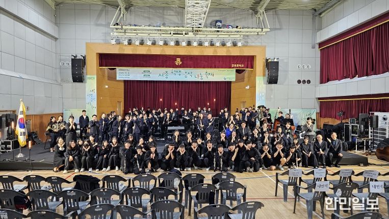 한민일보 서울포커스 곽동근 기자 | 세종특별자치시교육청은 11월 4일에 금호중학교 다목적강당에서 금호중학교(교장 강승연, 이하 금호중)의 ‘금호윈드오케스트라’(지도교사 조현영, 지휘자 연춘흠)와 연서중학교(교장 유효종)의 ‘연서오케스트라’(지도교사 이은정, 지휘자 김채연)가 함께 만드는 ‘2025 세종예술온(ON)학교’ 예술학교 ‘세종 학생 음악 나눔 축제’를 성황리에 마쳤다.