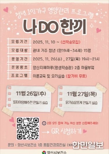 한민일보 서울포커스 김은금 기자 | 양산시보건소는 청년 1인 가구의 건강한 식습관 형성 및 자가 영양 관리 능력 향상을 위한 영양 관리 프로그램 ‘나DO한끼’를 11월 26일과 27일 양일간 운영한다고 밝혔다.