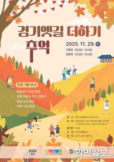 한민일보 서울포커스 김윤이 기자 | 경기문화재단 경기역사문화유산원는 오는 11월 29일 토요일, 의주길에 위치한 파주 혜음원지 일대에서 초등학생 이상 자녀를 둔 가족을 대상으로 하는 역사 체험 프로그램 ‘경기옛길 더하기 추억’을 개최한다고 밝혔다.