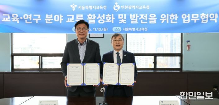 한민일보 서울포커스 유창렬 기자 | 인천광역시교육청은 10일 서울특별시교육청과 함께 읽걷쓰 교육과 심층 쟁점 독서토론 기반의 교육 혁신 및 교육·연구 교류 활성화를 위한 업무협약을 체결했다.