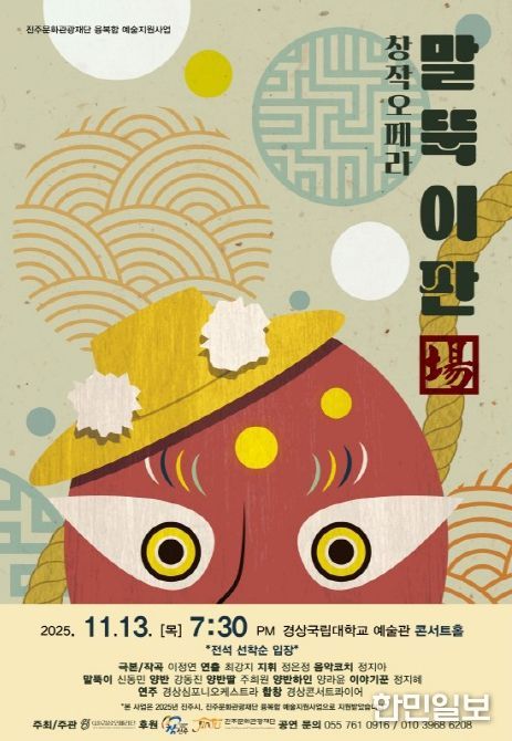 한민일보 서울포커스 박근원 기자 | 경상국립대학교 음악교육과 최강지 교수가 이끄는 경상오페라단은 진주의 대표 민속예술 ‘진주 오광대’를 모티브로 한 창작오페라 '말뚝이판場'(작사·작곡 이정연)을 11월 13일 오후 7시 30분 경상국립대학교 음악교육과 콘서트홀에서 초연한다.