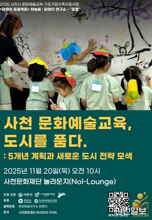 한민일보 서울포커스 김은금 기자 | 사천문화재단이 오는 11월 20일 오전 10시, 사천문화재단 놀라운지에서 “사천 문화예술교육, 도시를 품다 : 5개년 계획과 새로운 도시 전략 모색”을 주제로 한 포럼을 통해 문화예술교육을 도시 발전의 핵심 동력으로 삼기 위한 중장기 전략을 공개한다.