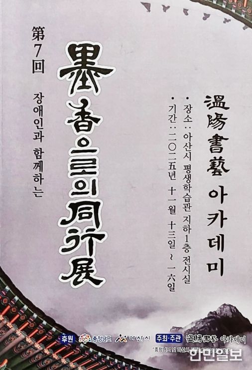 한민일보 서울포커스 김윤희 기자 | 아산시는 11월 13일부터 16일까지 4일간 아산시평생학습관 지하1층 전시실에서 온양서예아카데미(회장 이한용)가 주최・주관하고 충청남도와 아산시가 후원하는 ‘장애인과 함께 하는 묵향으로의 초대전’를 개최한다고 밝혔다.
