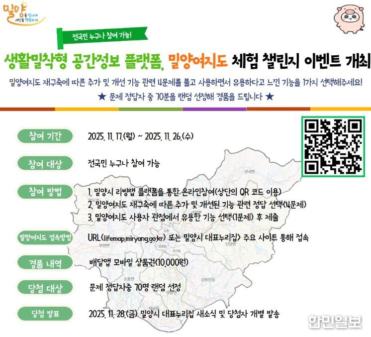 한민일보 서울포커스 김은금 기자 | 경남 밀양시는 17일부터 오는 26일까지 생활밀착형 공간정보 플랫폼 밀양여지도를 체험하고 혜택도 받을 수 있는 ‘밀양여지도 체험 챌린지 이벤트’를 진행한다고 밝혔다.
