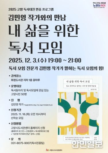 한민일보 서울포커스 김은금 기자 | 고양특례시는 오는 12월 3일 오후 7시, 화정도서관 지하 1층 꽃마루에서 독서모임 분야 전문가인 김민영 작가를 초청해 ‘김민영 작가와의 만남: 내 삶을 위한 독서 모임’프로그램을 운영한다고 밝혔다.