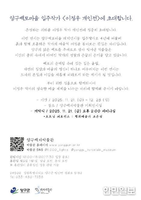 한민일보 서울포커스 진광성 기자 | 양구군은 이달 21일부터 12월 28일까지 양구백자박물관 세미나실에서 양구백토마을 입주작가 이정우의 개인전 ‘같음의 차이, 다름의 질서 – White, Wave, Trace’을 개최한다.