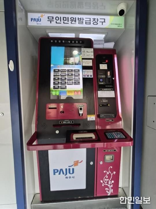 현재 파주시에는 총 45대(40개소)의 무인민원발급기가 설치되어 있으며, 18개 업무 123종의 민원서류 발급이 가능하다. 무인민원발급기 위치와 운영시간은 파주시청 또는 정부24 누리집에서 확인할 수 있다.