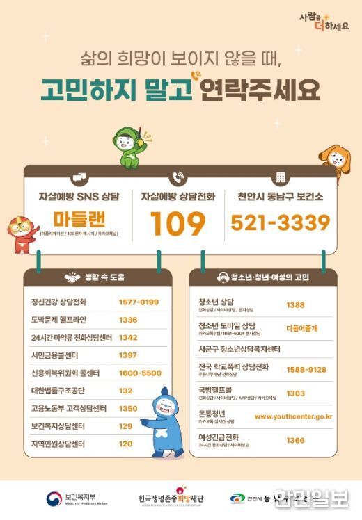 한편 삶에 희망이 보이지 않을 때는 고민하지 말고 24시 자살예방 상담전화(109), 천안시 동남구 자살예방센터, 서북구 자살예방센터 연락하면 전문적인 상담과 도움을 받을 수 있다.