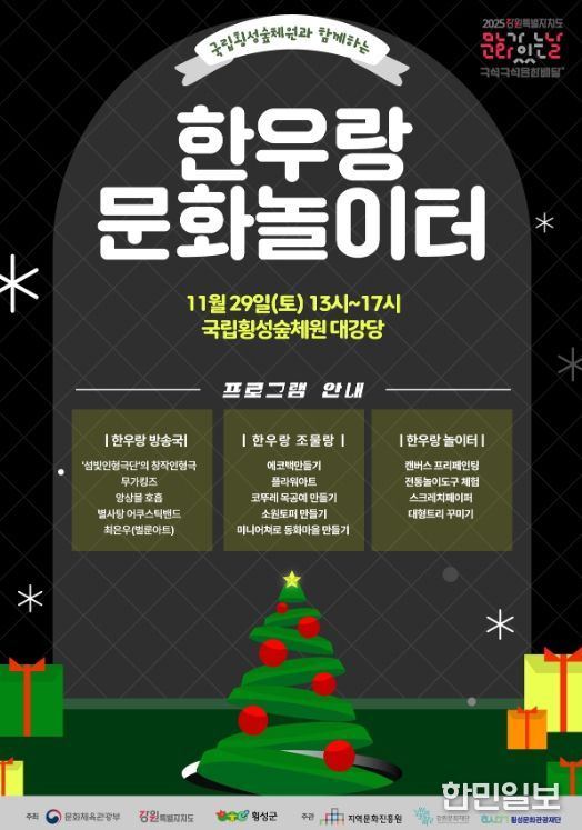 한민일보 서울포커스 진광성 기자 | 횡성문화관광재단은 오는 11월 29일, 국립횡성숲체원에서 올해 마지막 ‘2025 문화가 있는 날 구석구석 문화배달–한우랑문화놀이터’ 4회차 프로그램을 개최한다.