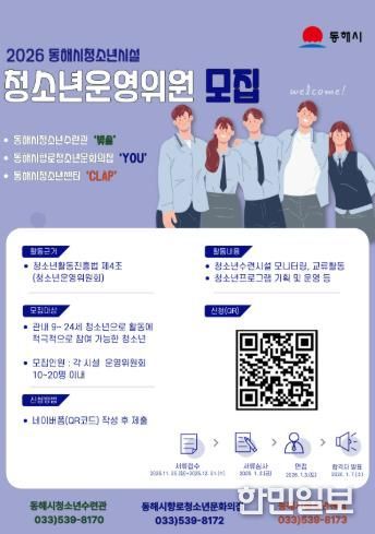 한민일보 서울포커스 임경복 기자 | 동해시는 2026년 동해시청소년시설(동해시청소년수련관, 동해시향로청소년문화의집, 동해시청소년센터)에서 활동할 신규 청소년운영위원을 모집한다.