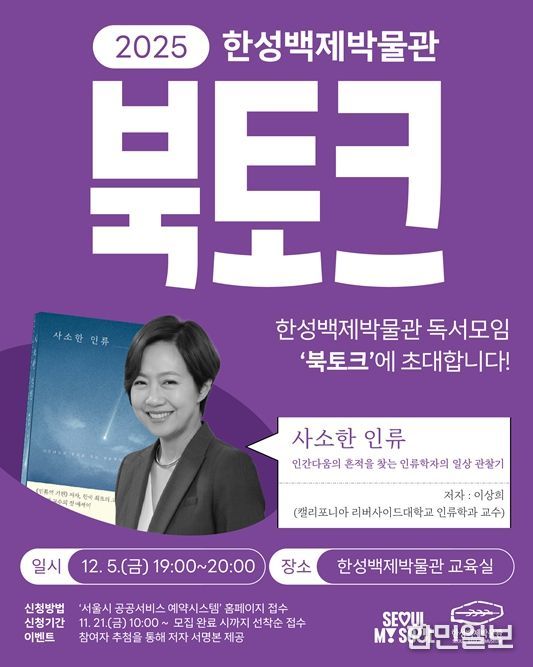 한민일보 서울포커스 국용호 기자 | 서울시 한성백제박물관은 올해 두 차례 운영된 역사독서모임 ‘북토크’를 12월 5일에 추가 개최한다고 밝혔다. 당초 연 2회 운영했으나 높은 시민 호응에 힘입어 추가 편성을 결정한 것이다. 이번 행사는 서울시 대표 야간문화 프로그램 ‘문화로 야금야금(夜金)’의 일환으로, 금요일 밤 박물관에서 역사학·고고학 분야 저자와 시민이 직접 소통할 수 있는 자리로 마련됐다.