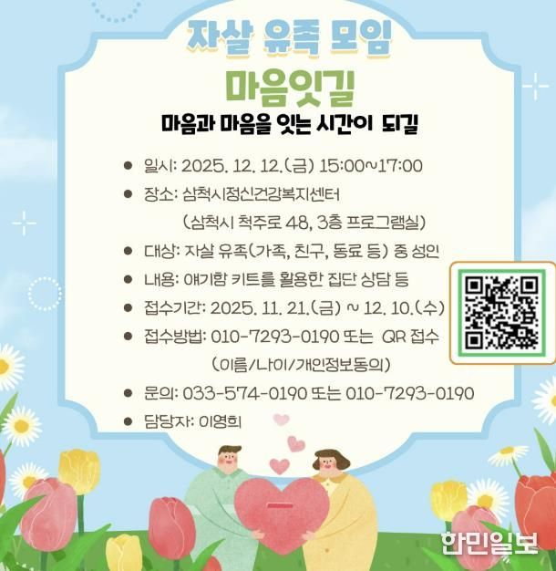 한민일보 서울포커스 임경복 기자 | 삼척시정신건강복지센터는 오는 12월 12일에 올해 마지막 ‘2025년 자살 유족 모임’을 진행한다고 밝혔다. 올해 네 번째로 열리는 정기 모임으로, ‘얘기함 키트’를 활용한 프로그램이 센터 내에서 운영될 예정이다.