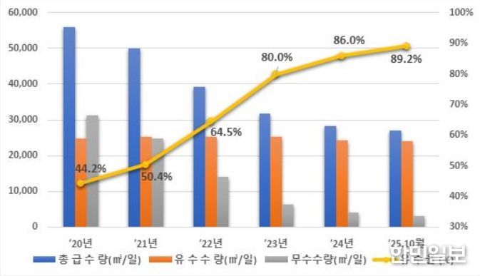경제적 효과도 상당하다. 누수 절감으로 연간 128억 원의 편익이 발생했으며, 3만 ㎥ 규모 정수장 신설을 대체하는 효과를 거뒀다. 수질 모니터링 15개소에서 28항목을 점검한 결과 탁도와 중금속 수치도 개선됐다.