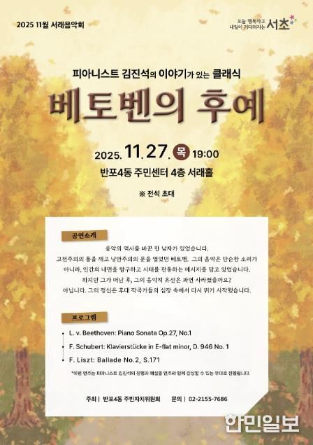 반포4동 주민자치위원회(위원장 장영화)가 주최하는 서래음악회는 매 분기 지역 주민들에게 다양한 음악적 경험을 제공하는 공연 프로그램이다. 이번 11월 서래음악회는 ‘베토벤’을 중심으로 고전주의를 넘어 낭만주의의 문을 연 그의 음악 정신이 후대 작곡가들에게 어떻게 계승됐는지를 보여줄 예정이다. 베토벤을 비롯해 슈베르트, 리스트 등 낭만주의 작곡가들의 작품을 한 무대에서 감상할 기회다.