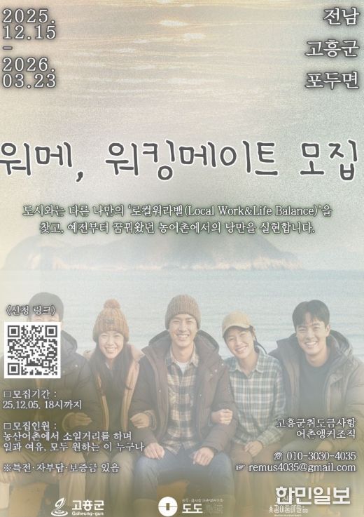 한민일보 서울포커스 임광현 기자 | 고흥군은 고흥군 취도·금사항 어촌신활력증진사업 앵커조직 활동의 일환으로, 농어촌의 계절별 일거리와 산업을 조합해서 일 경험과 지역 체류를 함께 제공하는 ‘워-메(Working-Mate)’ 프로그램을 시행한다고 밝혔다.