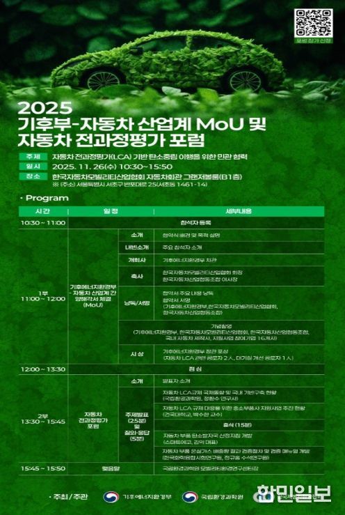 한민일보 서울포커스 진광성 기자 | 기후에너지환경부는 11월 26일 자동차회관(서울시 서초구 소재)에서 국내 자동차 업계와 ‘자동차 온실가스 전과정평가(LCA) 역량 강화 및 탄소중립 협력을 위한 업무협약’을 체결한다고 밝혔다.