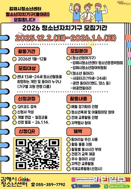한민일보 서울포커스 김은금 기자 | 김해시청소년센터는 2026년 청소년자치기구(동아리)를 모집한다고 27일 밝혔다.