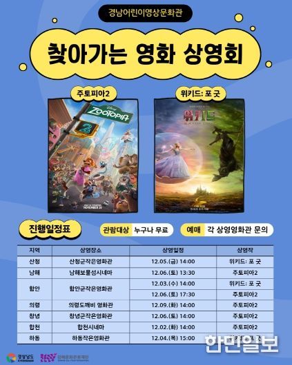 이번 찾아가는 영화상영회는 산청, 남해, 함안, 의령, 창녕, 합천, 하동의 작은 영화관과 협력하여 지역 주민들에게 영화를 선보이는 특별한 행사로 어린이와 가족들이 함께 즐길 수 있는 영화 ‘주토피아2’와 ‘위키드: 포 굿’을 무료로 상영한다.