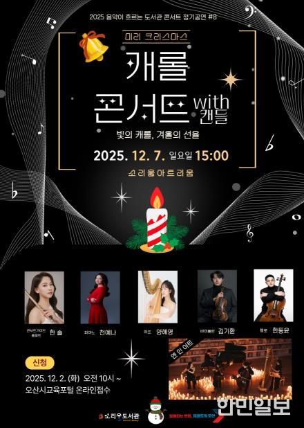 한민일보 서울포커스 임경복 기자 | 경기도 오산시 소리울도서관은 연말을 맞아 시민들에게 겨울 감성을 선사하는 '미리 크리스마스 – 캐롤 콘서트 with 캔들'을 오는 12월 7일 오후 3시 소리울아트리움에서 개최한다고 밝혔다.