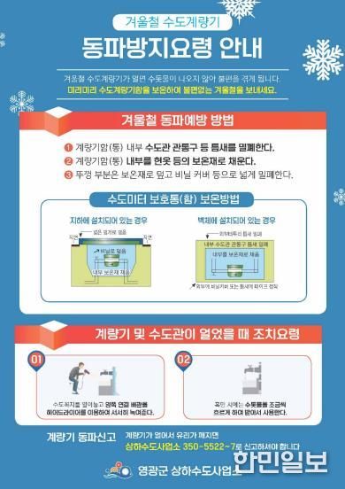 한민일보 서울포커스 박용남 기자 | 영광군 상하수도사업소에서는 수도시설 동파로 인한 주민불편 예방을 위해 겨울철 수도시설 동파 방지 대책 계획을 수립하고 수용가를 대상으로 수도계량기함과 옥내 급수관 보온조치 등 겨울철 수도계량기 동파방지를 위해 홍보하고 있다.