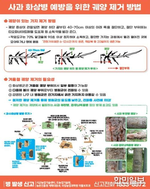 특히 동계 정지·전정 시 사용하는 가위·톱 등 작업도구와 장갑을 통한 전염 가능성이 큰 만큼, 작업 전·후 소독을 반드시 실시하고 절단면에는 방제약제를 도포해 추가 감염을 예방해야 한다.