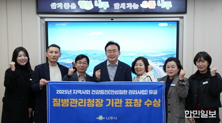 28일 나주시에 따르면 보건소 건강증진과는 2025년 호남권 만성질환 관리사업 ‘지역사회 건강증진’ 분야에서 우수 유공기관으로 선정돼 질병관리청장 표창을 수상했다.