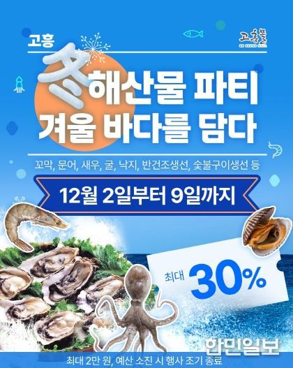 한민일보 서울포커스 임광현 기자 | 고흥군이 운영하는 온라인 농수축특산물 쇼핑몰 ‘고흥몰’은 본격적인 겨울철을 맞아 12월 2일부터 9일까지 ‘고흥 동(冬)해산물 파티–겨울 바다를 담다’ 기획전을 진행한다고 밝혔다.