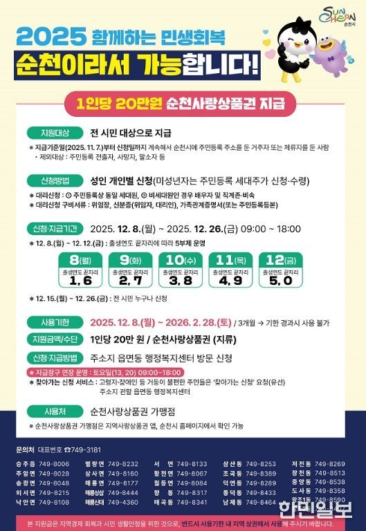 순천사랑상품권(지류, 1만 원권)으로 지급되며, 상품권은 2025년 12월 8일부터 2026년 2월 28일까지 3개월간 사용 가능하다.