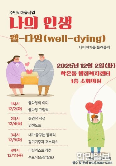 한민일보 서울포커스 임광현 기자 | 광명시 학온동 주민자치회는 오는 12월 2일부터 매주 화요일과 목요일 오후 2시부터 4시까지 총 4회에 걸쳐 ‘웰다잉 교육’을 진행한다.