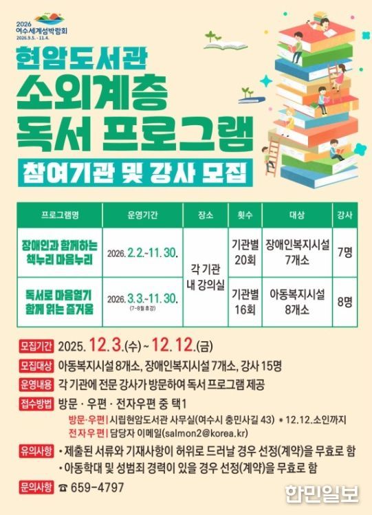 한민일보 서울포커스 임광현 기자 | 여수시립현암도서관은 오는 12월 3일부터 12일까지 소외계층 독서 프로그램 참여 기관을 공개 모집한다.