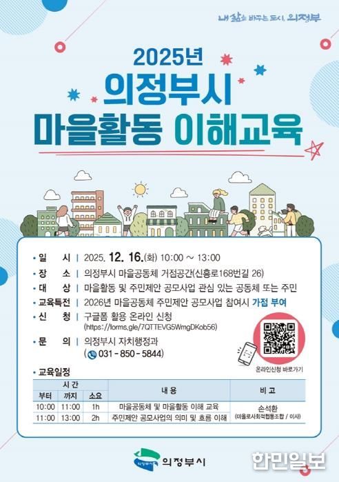 한민일보 서울포커스 심기옥 기자 | 의정부시는 12월 16일 의정부시 마을공동체 거점공간(신흥로168번길 26)에서 마을공동체에 대한 시민들의 참여 확대와 지속적인 관심을 유도하기 위한 ‘2025년 마을활동 이해교육’을 운영한다.