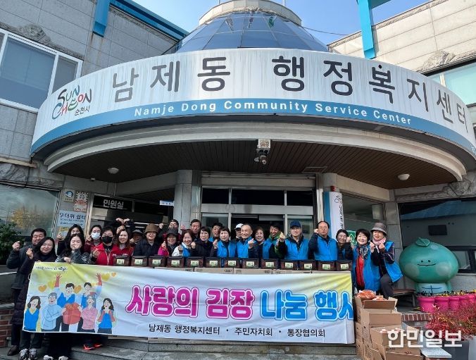한민일보 서울포커스 임광현 기자 | 순천시 남제동은 지난달 27일 농산물도매시장에서 남제동주민자치위원회와 통장협의회 등 직능단체 회원 30여 명이 참여해 ‘사랑의 김장나누기 행사’를 진행했다고 밝혔다.