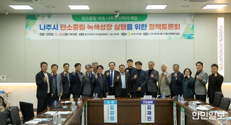 한민일보 서울포커스 임광현 기자 | 나주시의회는 지난 11월 28일 동신대학교 혁신융합캠퍼스에서 에너지발전특별위원회 주관으로 '나주시 탄소중립·녹색성장 실행을 위한 정책토론회'를 개최해 지역 특성에 맞는 탄소중립 실천 전략과 중장기 산업전환 방향을 폭넓게 논의했다.