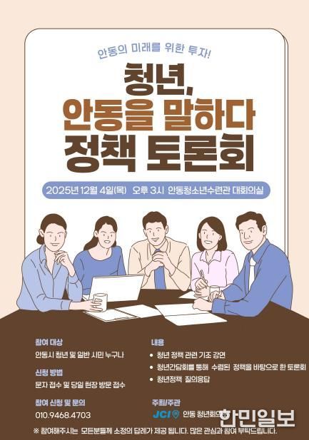 한민일보 서울포커스 김봉순 기자 | 안동청년회의소가 지역 청년의 현실을 있는 그대로 마주하기 위해 오는 12월 4일 오후 3시, 안동시청소년수련관 대회의실에서 ‘2025 안동시 지방시대 역량강화 청년 정책 토론회’를 개최한다.