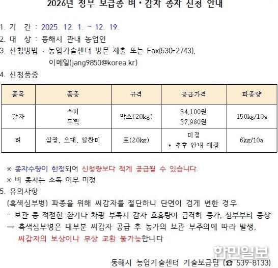 한민일보 서울포커스 임경복 기자 | 동해시는 2026년 농사를 준비하는 관내 농업인을 대상으로 정부 보급종 벼·감자 종자 신청을 받는다.