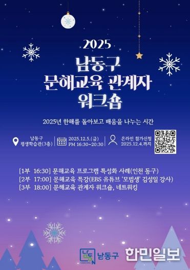 한민일보 서울포커스 김성혜 기자 | 인천시 남동구는 성인 문해 관계자 20여 명이 참석하는 ‘2025년 성인 문해교육 관계자 연수’를 개최한다고 3일 전했다.
