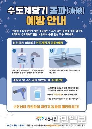 한민일보 서울포커스 박용남 기자 | 이천시는 본격적인 겨울철이 다가오면서 겨울철 한파 대비 수도시설 동파 방지 대책을 수립하고 수도계량기 동파 예방 3대 실천 요령에 대해 대대적인 홍보에 나섰다.