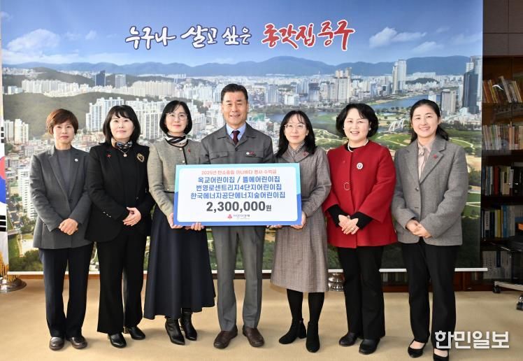한민일보 서울포커스 기자 | 국공립 번영로센트리지 4단지어린이집과 옥교어린이집, 뜰에어린이집, 한국에너지공단 에너지숲어린이집이 12월 3일 오전 11시 중구청 구청장실을 찾아 울산사회복지공동모금회를 통해 이웃돕기 후원금 230만 원을 전달했다.