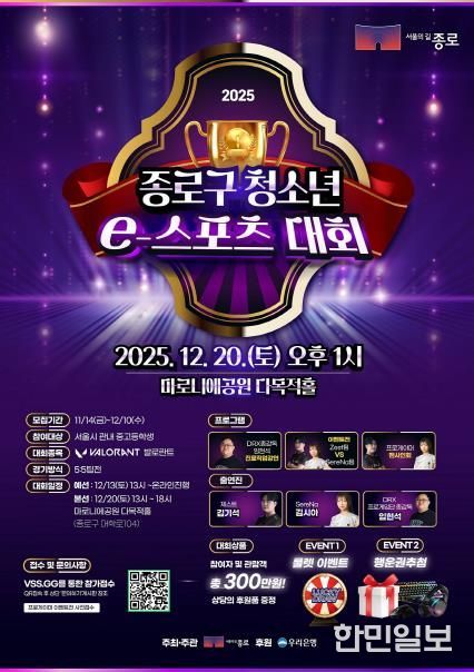 한민일보 서울포커스 김서윤 기자 | 종로구는 12월 20일 13시 마로니에공원 다목적홀(대학로 104)에서 '2025 종로구 청소년 e스포츠 대회'를 개최한다.