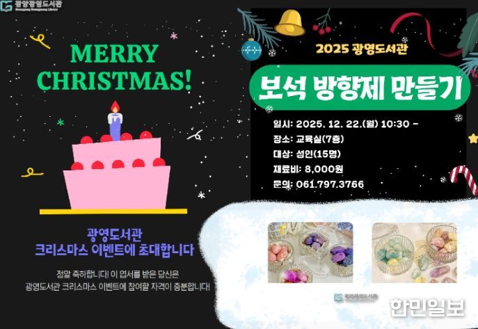 한민일보 서울포커스 임광현 기자 | 광양광영도서관은 도서관 이용 활성화와 시민들의 문화 향유 기회 확대를 위해 12월 1일부터 28일까지 ‘2025 크리스마스 특별 행사’를 운영한다고 밝혔다.