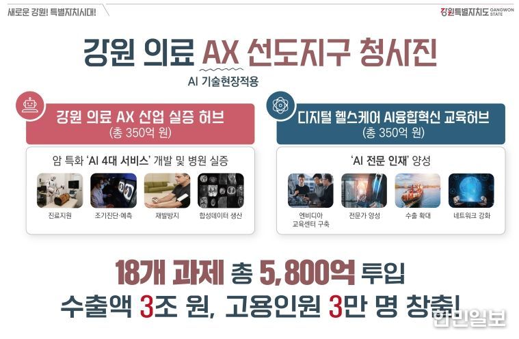 한민일보 서울포커스 곽중희 기자 | 강원특별자치도는 올해 7월부터 기획해 온 총 5,800억 원 규모의 '강원 의료 AX 첨단산업 육성 프로젝트'가 2026년 정부예산에 핵심 기반사업 2개가 신규 반영됨에 따라 본격적인 출발선에 섰다고 밝혔다.