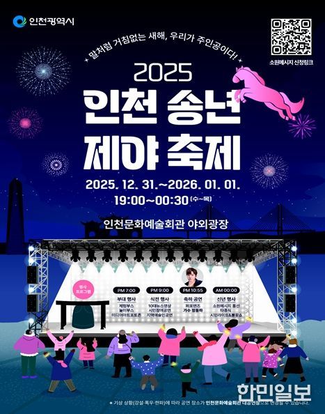 한민일보 서울포커스 임경복 기자 | 인천광역시는 오는 12월 31일, 한 해의 마무리와 새해의 시작을 시민과 함께 기념하기 위해 ‘2025 인천 송년제야 축제’를 인천문화예술회관 야외광장에서 개최한다고 밝혔다.