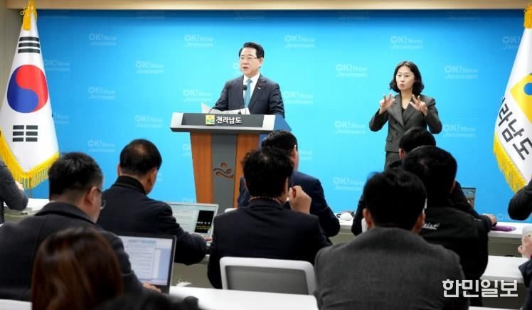 한민일보 서울포커스 박정민 기자 | 김영록 전라남도지사는 23일 도청 브리핑룸에서 2025년 송년기자간담회를 열어 국고 10조 시대 개막, AI·에너지 미래기반 대거 마련 등 민선 7·8기 성과를 설명하고, 전남 대부흥 비전과 2026년 도정 방향을 발표했다.